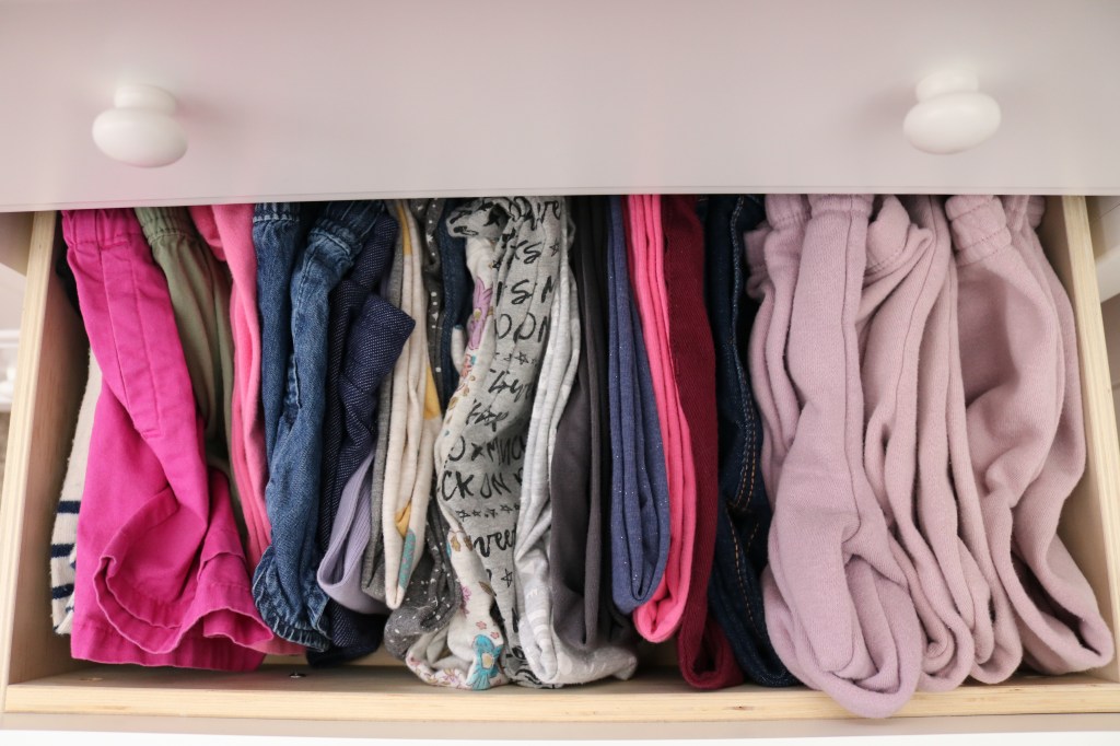 Organizing their clothes is a monthly job with how fast these little cuties grow. I found folding the clothes as shown above can really add space. You only need three drawers per child.