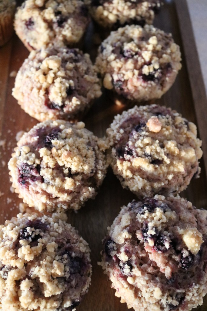 My toddler had a blast helping me make the crumble! It is easy to stir and have fun with. It’s also more of a powder similar to snow for pretend that she plays with, thinking it’s snow from Frozen. I usually let her top the muffins we make. This time we used blueberries.