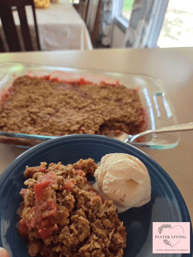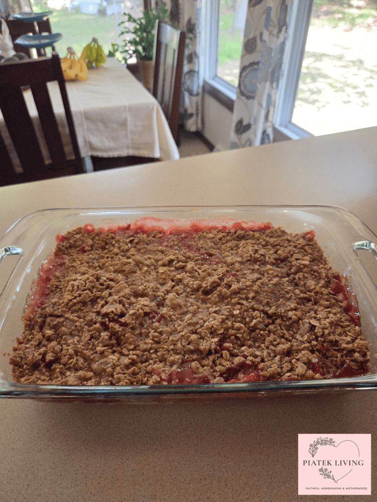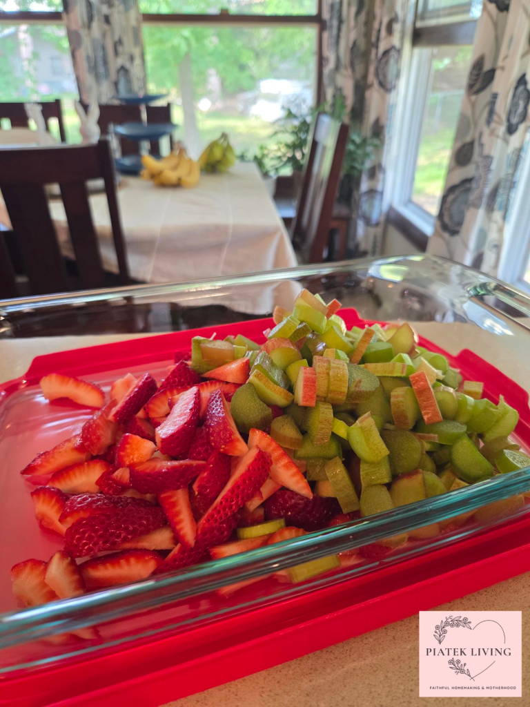 When your neighbors give you rhubarb, you have a reason to make crisp! Tart, sugary dessert but filled with antioxidants and more! Rich in vitamin K, fiber, calcium, potassium, and even manganese. I love to eat with the seasons. Rhubarb is a lovely sweet to wait for each year. It pairs great with vanilla ice cream. Yum! You could make the rhubarb on its own, or you can add strawberries. Since I didn’t have as much rhubarb, I decided to add in strawberries to get about 6 cups of fruit including the rhubarb.